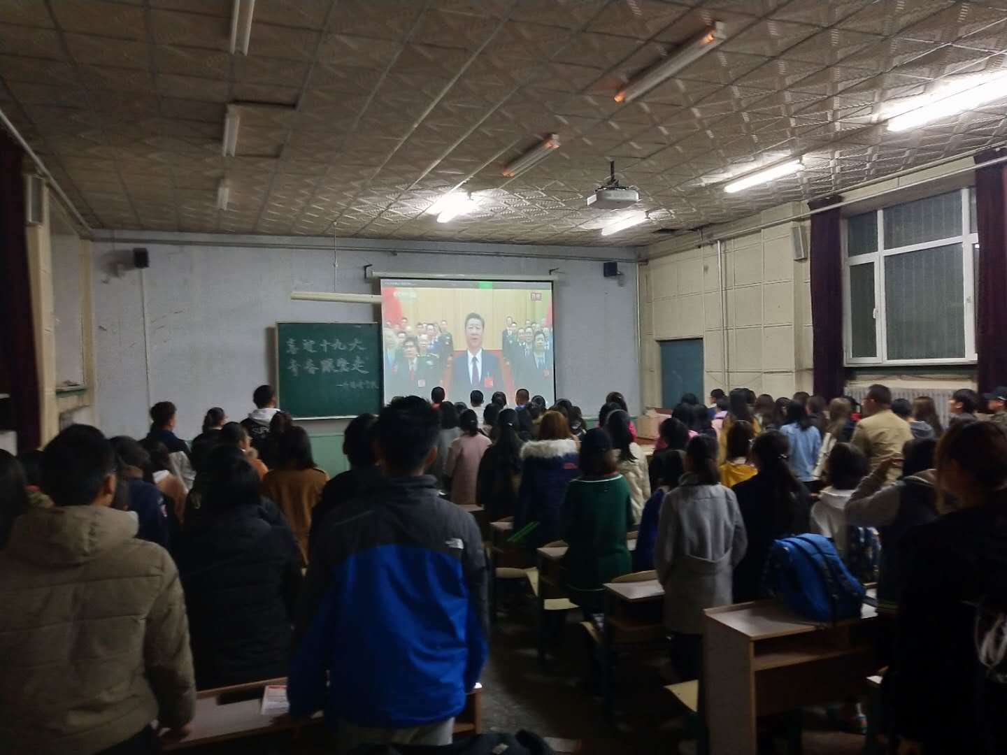 于10月18日晚上六点三十分在东一号楼阶梯4教室组织全院学生观看了“中国共产党第十九次代表大会”开幕式。 中国共产党第十九次代表大会,是在全面建设小康社会的决胜阶段、中国特色社会主义进入新时代的关键时期召开的一次十分重要的大会。会上,习主席代表十八届中央委员会向大会作题为《决胜全面建设小康社会,夺取新时代中国特色社会主义伟大胜利》的报告。其次,习主席强调我们要不忘初心、牢记使命,高举中国特色社会主义伟大旗帜,为实现中华民族的伟大复兴的中国梦不懈奋斗;同时习主席还提到我国的社会主义矛盾已经转化为为人名日益增长的美好生活需要和不平衡不充分的发展之间的矛盾。在直播的最后,习主席提出新时代坚持和发展中国特色社会主义的基本方略。