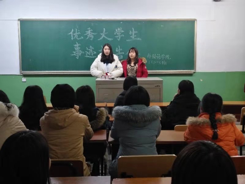 161003班于主楼711教室召开了优秀大学生事迹报告会,优秀大学生代表研究生于鑫、研究生郑佳薇以及161003班全体同学参加了此次报告会。
